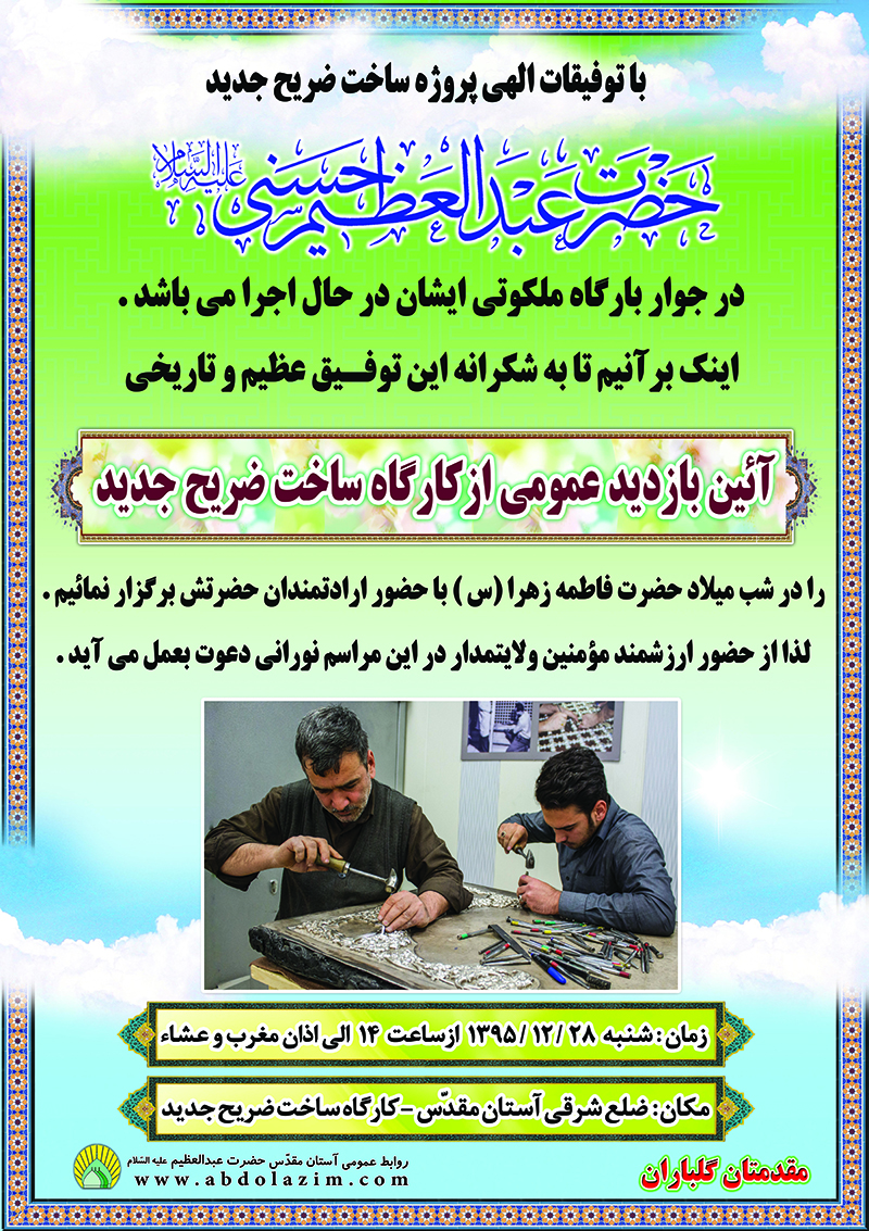 همزمان با شب ولادت باسعادت حضرت زهرا سلام الله علیها بازدید از کارگاه ساخت ضریح جدید حضرت عبدالعظیم علیه السّلام برای عموم مردم بازگشایی میشود .