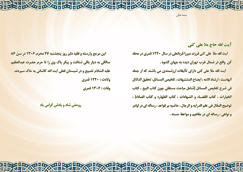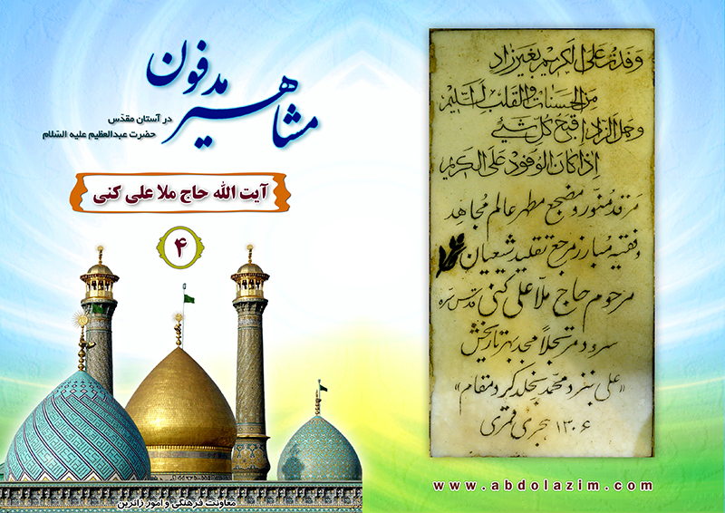 آیت الله العظمی حاج علی كنی فرزند میرزا قربانعلی در سال 1220 قمری در محله كن واقع در شمال غرب تهران دیده به جهان گشود تحصیلات مقدماتی را در مكتب طی نمود و با اندیشه حضور در حوزه علوم دینی ابتدا در تهران و اصفهان و سپس راهی نجف اشرف شده و از ذخایر گران سنگ آن حوزه بهره‌‌مند گردید .اساتید ایشان حضراتی چون شیخ محمد حسن نجفی ـ شیخ حسن كاشف الغطاء و شیخ مشكور حولاوی نجفی و همچنین با مرحوم حاج شیخ مرتضی انصاری هم مباحث بوده است و در حوزه علمیه كربلا از محضر دو استاد برجسته دیگر چون شریف العلماء مازندرانی و سید ابراهیم قزوینی كسب فیض نموده و دوره عالی فقه و اصول را گذراند. ملاعلی كنی پس از سالها تلاش در راه فراگیری فقه و اصول كه سختیهای بسیاری را برای او به دنبال داشت به مقام اجتهاد و استنباط احكام دینی رسید . سپس در سال 1262 ق به تهران بازگشت و به تعلیم و تربیت نسل جوان و پاسخگویی به سوالات دینی و رسیدگی به مشكلات مردم همت گماشت و در سال 1271 قمری رساله عملیه خود را به چاپ رساند . ایشان تولیت مدرسه مروی را عهده دار شد و با نظارت و حسن تدبیر او نظم شایان تحسینی بر برنامه های آن محیط معنوی و روحانی حكمفرما گشت. آن فقیه برجسته ، تربیت شاگردان را یكی از اهداف اساسی خود قرار داد و به برپایی درس فقه و اصول و دیگر رشته های علوم اسلامی اقدام ورزید . رسیدگی به ضعیفان و مستمندان جهت رفع گرفتاری آنان از صفات بارز ملا علی كنی بود ایشان چون پدری دلسوز بسیاری از یتیمان را تحت تكفل قرار داده و برای حل مشكل بیمارانی كه بنیه مالی ضعیفی داشتند مكانهایی را به منظور پرداخت پول داروها در نظر گرفته بود و همچنین ساخت آب انبار و كاروانسرا از دیگرخدمات عمومی و عام المنفعه ایشان بود. مبارزه با استعمار و استبداد در صدر اهداف سیاسی و اجتماعی ایشان در طول عمر پربارشان بود كه از جمله هدایت و رهبری مبارزه با قرارداد ننگین رویتر و تشكیلات فراماسونری در ایران بوده است. آیت الله ملا علی كنی دارای تالیفات ارزشمندی می باشند كه از جمله ، ارشاد الامه ،ایضاح المشتبهات ، تحقیق الدلائل فی شرح تلخیص المسائل (شامل مباحث مستقلی چون كتاب البیع ، كتاب الخیارات ،‌كتاب القضاء و كتاب الشهادات ، كتاب الطهارُ و كتاب الصلاه )، تلخیص المسائل ، توضیح المقال فی علم الدرایـه و الرجال ،حاشیه بر قواعد، رساله ای در اوامر و نواهی ، رساله ای در مفاهیم و مواعظ حسنه. این مرجع وارسته و فقیه دلیر روز پنجشنبه 27 محرم 1306 قمری در سن 86 سالگی به دیار باقی شتافت و پیكر پاك آن عزیز را تا حرم حضرت عبدالعظیم علیه السّلام تشییع و در شبستان فعلی آیت الله كاشانی به خاك سپردند.